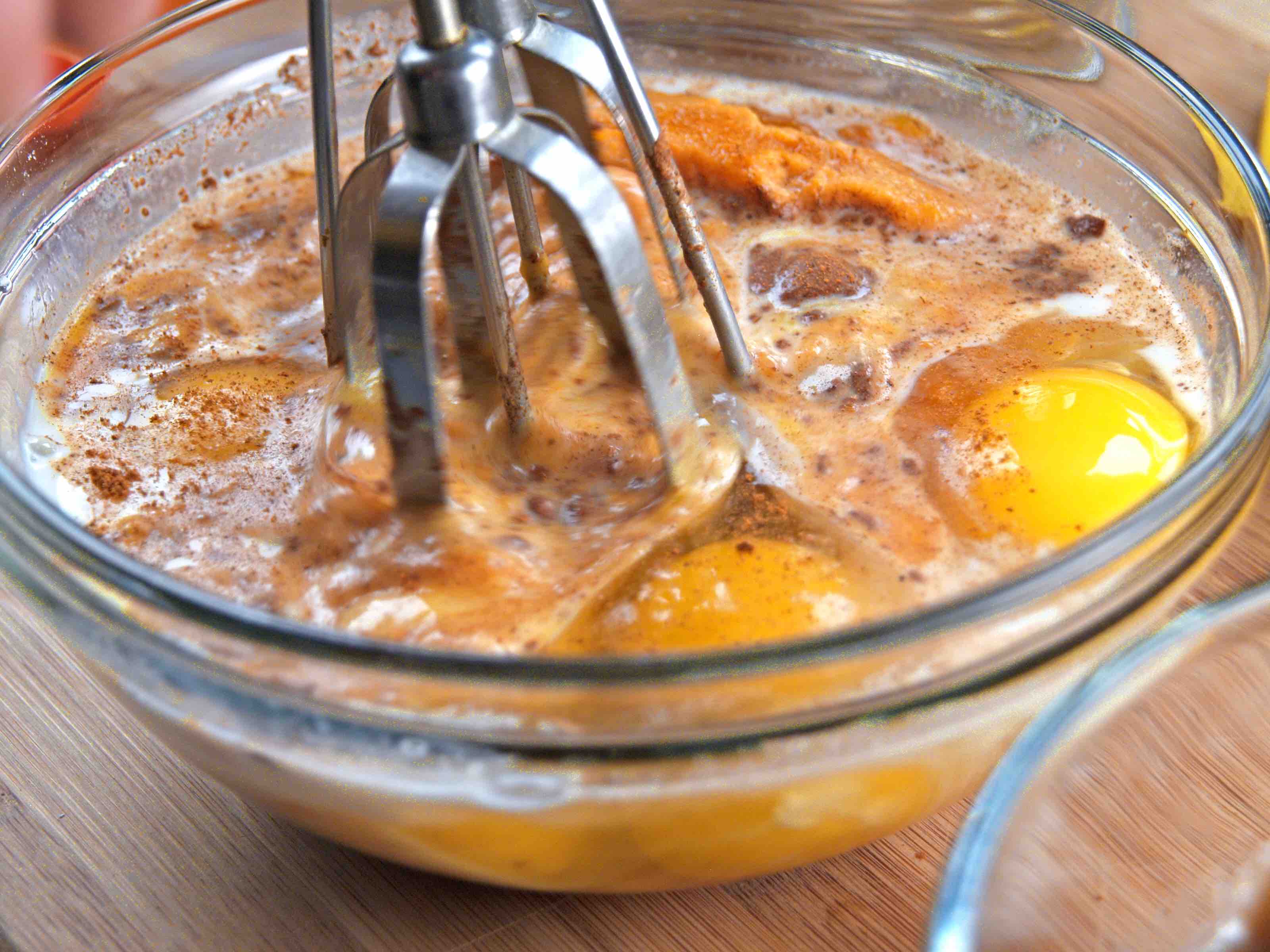 - In a separate bowl mix eggs, milk, vanilla, pumpkin, and the other half of the spices.